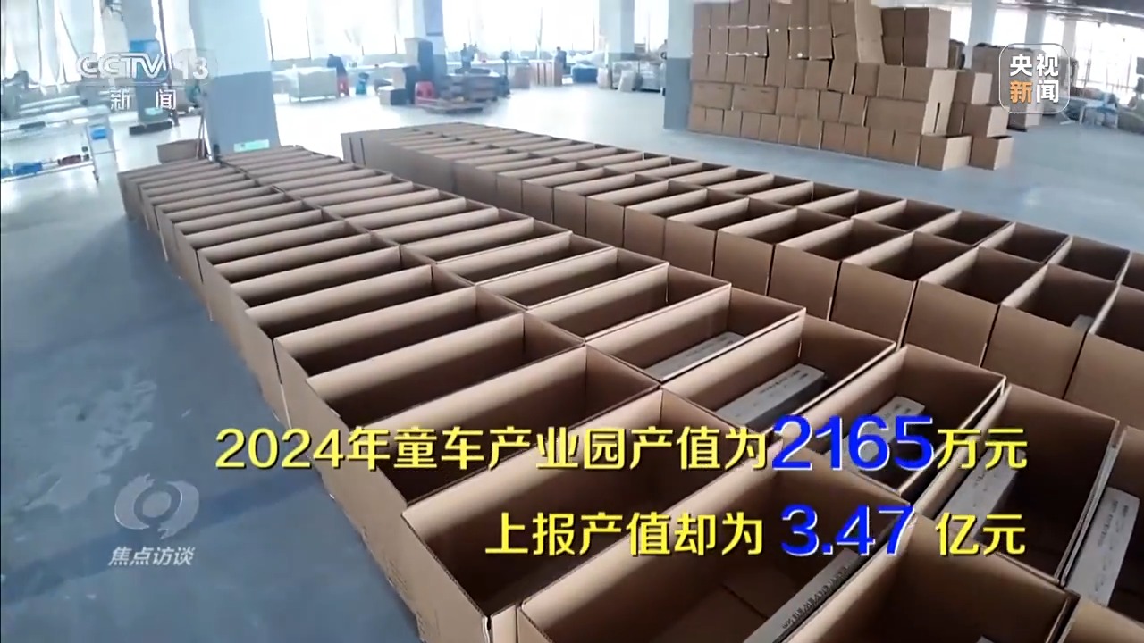 记者实地探访发现,所谓的“童车产业园”并不生产童车。比企业数量夸大更严重的是产值注水:2024年产业园实际产值为2165万元,上报产值却高达3.47亿元。