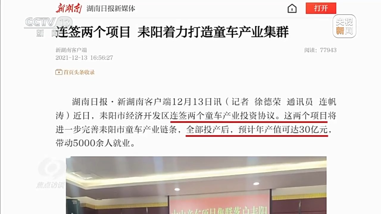湖南耒阳市委常委、耒阳高新区党工委书记 周斐:我们后来了解到,当时整个全国的婴儿推车市场,大概100多个亿。比较有名的河北平乡,大大小小有2000多家企业,还有广东中山、湖北汉川、浙江平湖、江苏昆山,都是沉淀了几十年在发展。所以确实存在情况不明决心大,提这种东西出来,相对来说就比较草率了。