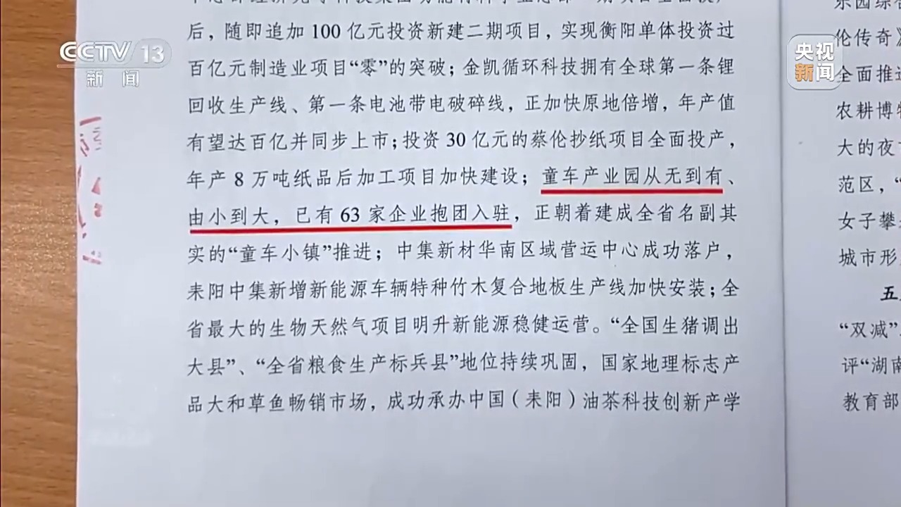 记者调查发现,童车产业的虚假数字,也被连续多年写进耒阳市政府工作报告,其中提到:2021年,纸品、新材料板、童车和冶金化工等四个百亿级产业链加力构建;2022年,童车产业园已签约、注册相关企业42家;2023年,童车产业园新增40多家企业签约入驻。而到了2024年10月,一份耒阳市委、市政府向上级的“工作情况汇报”中,则宣称“童车产业园从无到有、由小到大,已有63家企业抱团入驻”。口号越喊越响,实干越来越少,“百亿级童车产业园”彻底沦为“口号工程”。